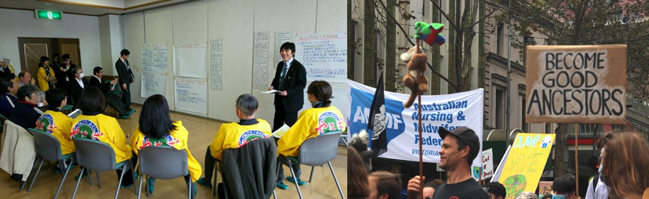 일본 미래 디자인(Future Design) 회원들은 지역 주민을 모아 마을과 도시를 위한 의견을 얻고 계획을 세운다. 절반은 현재 주민 역할, 나머지 절반은 특수 의상을 입은 2060년 미래 주민 역을 맡는다. 미래 주민은 변혁적 도시 계획을 지지한다. 의료계 투자, 기후 변화 대책 등 획기적인 미래 시민 의회 형태가 야하바(矢巾) 같은 작은 마을부터 교토 대도시까지 일본 전체로 퍼져나가고 있다. 지구촌에도 적용한다면 어떨까? 미래 세대의 권리 보호를 위해 시대 반항자들은 재판소에도 눈을 돌리기 시작했다. 공공 이익을 추구하는 비영리 법무 조직 'Our Children's Trust'는 현재와 미래 세대 모두에 대한 안전한 기후와 공기를 누릴 법적 권리를 주장하는 21명의 어린이를 대신해서 미국 정부를 상대로 획기적인 소송을 냈다. 콜롬비아, 파키스탄, 우간다, 네덜란드 등으로 이런 추세가 퍼져나갔다. 이러한 움직임의 물결은 점점 더 커지고 있다. 뉴질랜드 '아오테아로아'의 '황가누이(Whanganui)' 강부터, 인도의 갠지스, '야무나(Yamuna)' 강까지 자연에 법인격을 부여하려는 움직임도 대두되었다.