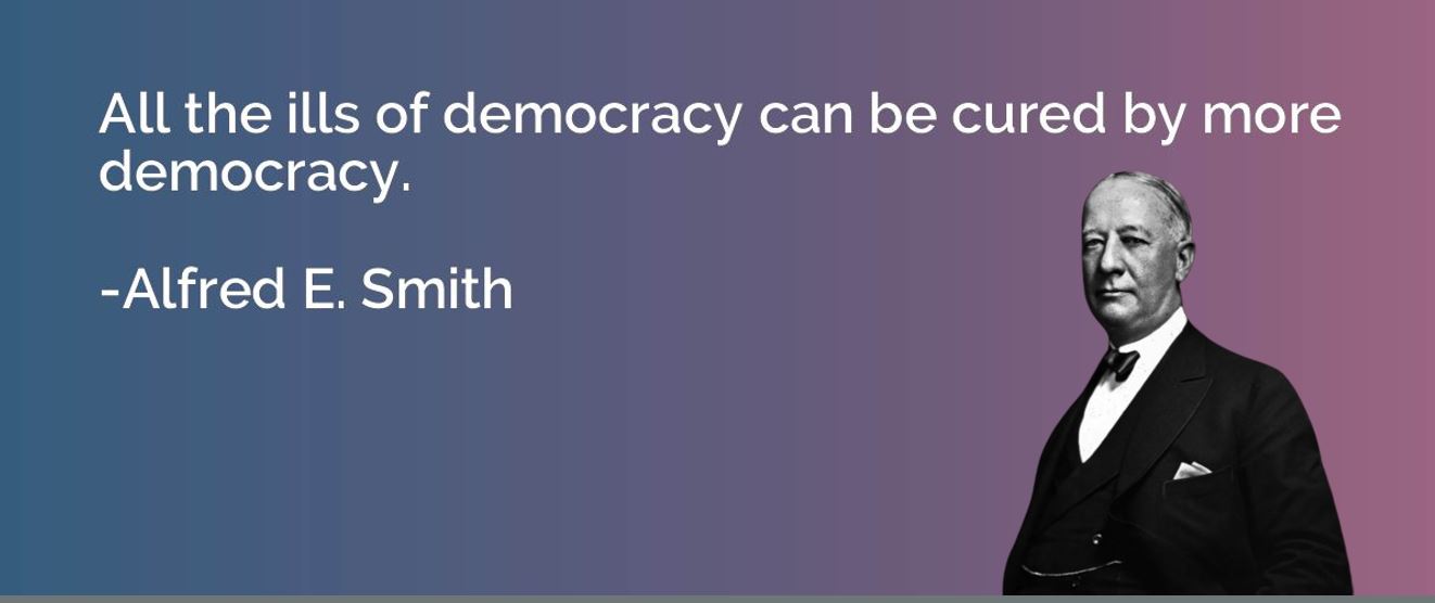 알프레드 에마누엘 스미스(Alfred Emanuel Smith, 1873-1944)는 “민주주의의 모든 병폐는 더 많은 민주주의로 치료될 수 있다” 명언을 남겼다. "더 많은"의 의미는 다른 맥락이다. 단지 현세대를 더 많이 대표하라는 것이 아니라 미래 세대, 즉 젊은 세대를 더 많이 대변해야 한다는 의미다. 세계적으로 어린이와 청소년 시위와 환경 운동을 시작되었지만, 과거 식민 정부가 독립운동을 범죄화했던 것처럼, 현재 정권들은 이를 부정하고 식민지적 행동을 하고 있다.