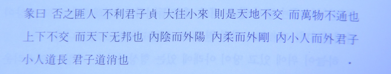 비는 인이 아니다. 군자가 올바름을 피기에는 이롭지 못하다. 큰것을 잃고 작은것을 얻을것이다. 천과 지는 서로 만나지 못하고 만물운 서로 통하지 못한다. 상하의 마음이 서로 화합되지 못한다. 천하에 나라가 없는 형국이다. 내괘가 음이고 외괘가 양이다. 이것은 내심은 유약하면서 겉으로는 강장함을 가장하는 것이다. 권력의 핵심은 소인들 차지가 되고 군자는 변두리로 밀려난다. 그리하여 소인의 도는 장성하고 군자의 도는 소멸한다.