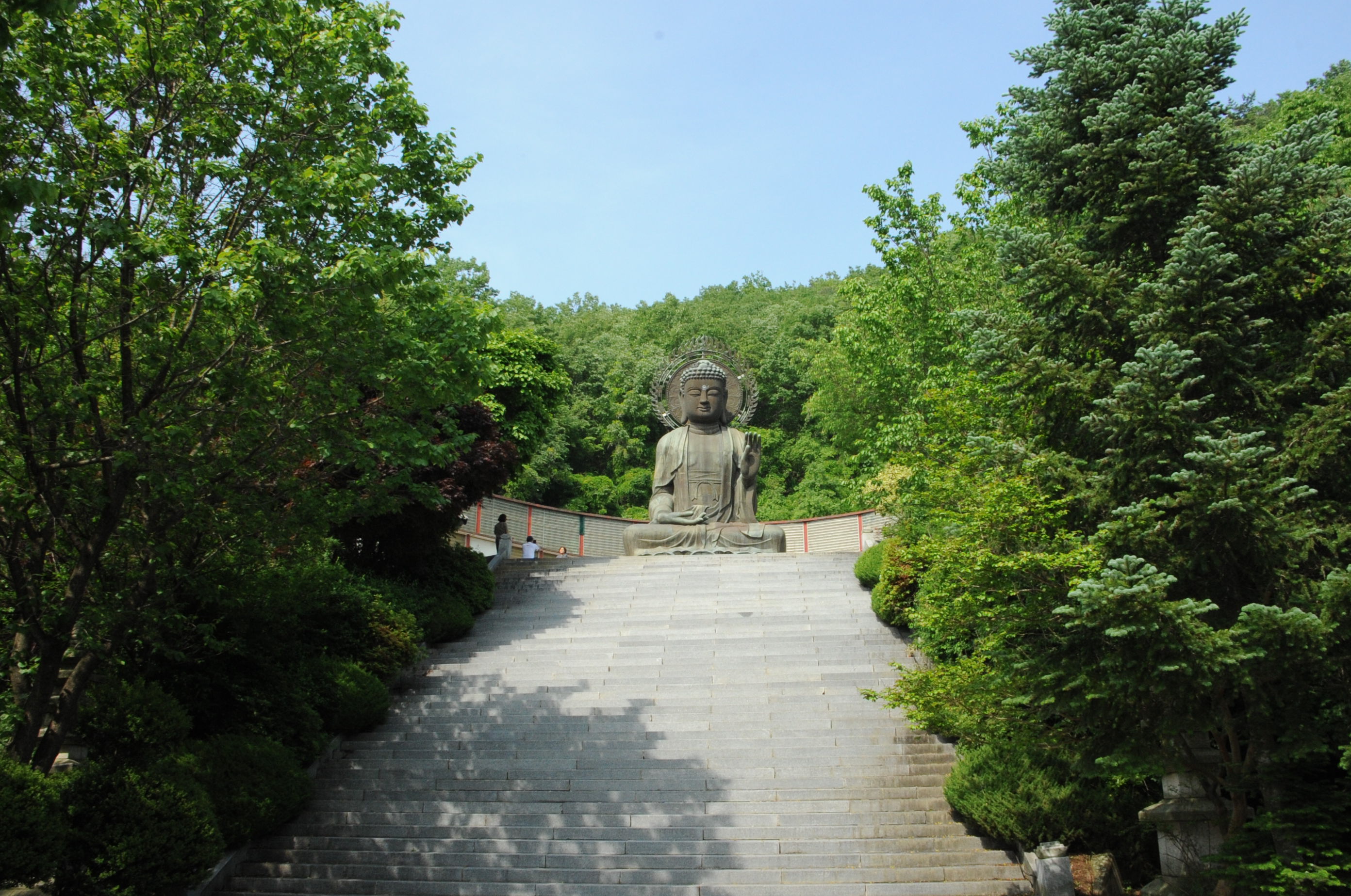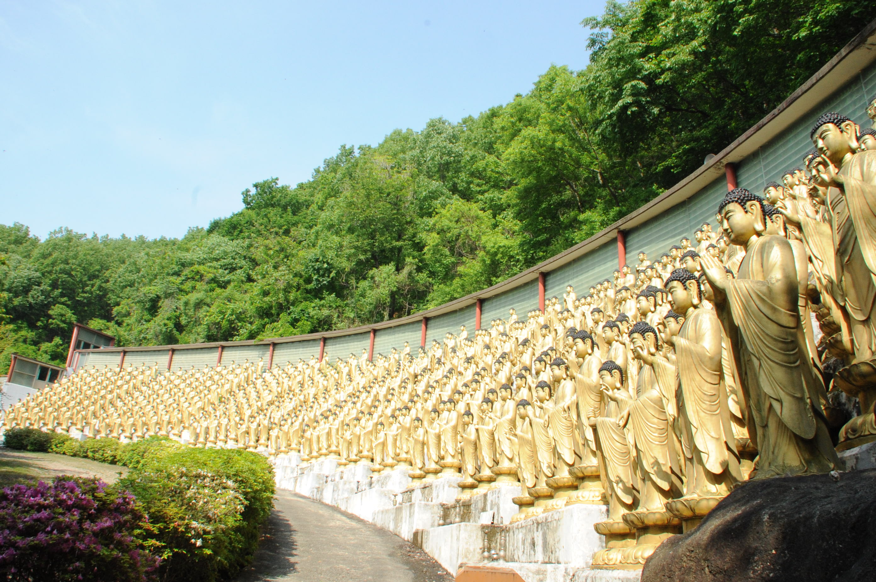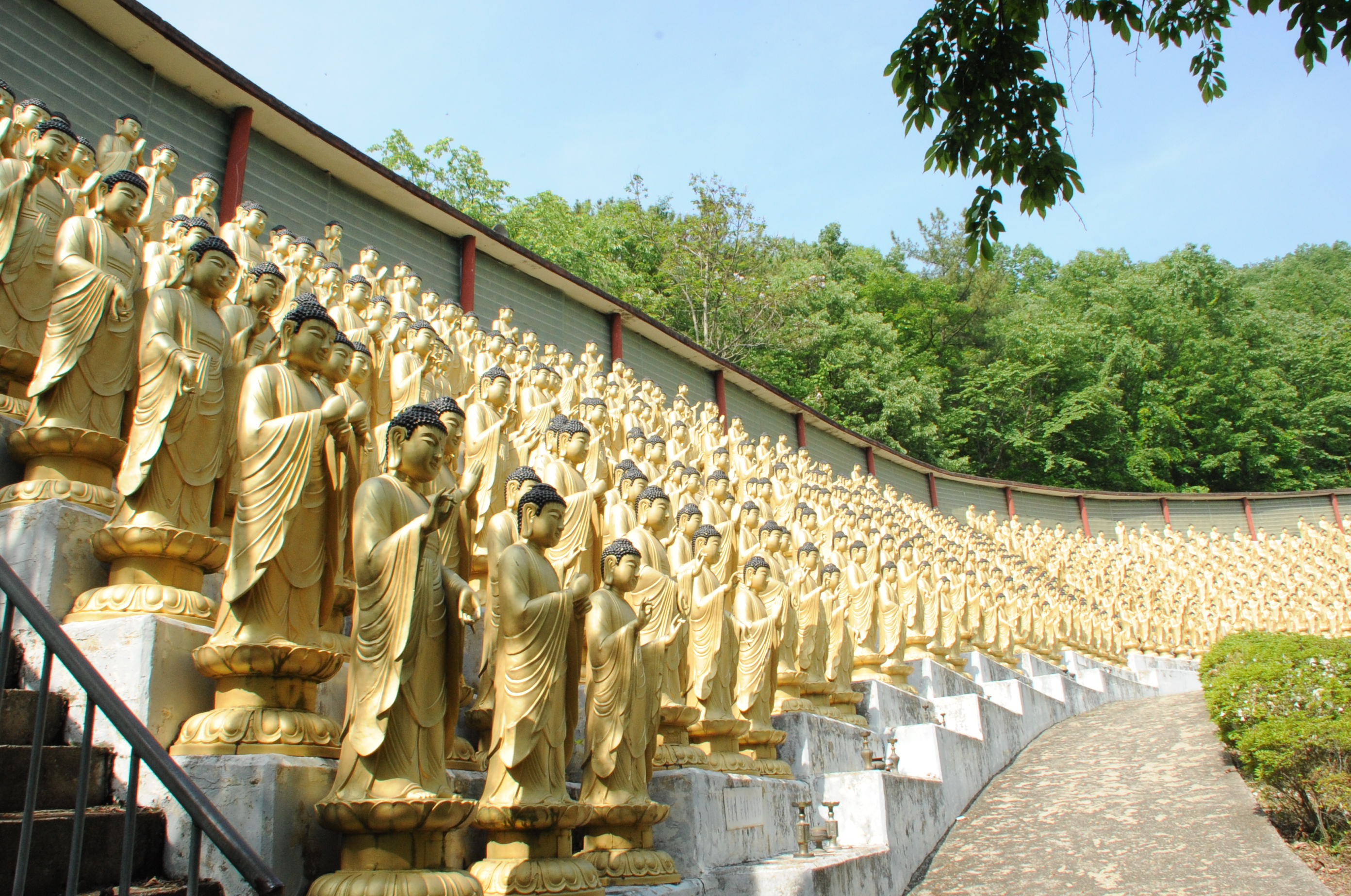 또한, 전체길이 210m에 이르는 말굽 모양의 계단 10개에는 1,000 불상이 있는데 이 불상들도 높이가 1.9m로 높다. 그뒤로는 개인의 소원을 담는 원불로 야광여래 333,333 불상이 있는데, 이는 석가가 이세상의 중생을 직접 교화할 때 영취산에서 1,250여 명의 비구승을 모아놓고 대승의 참진리인 《묘법연화경》을 설법하던 모습을 그대로 재현한 것이다.