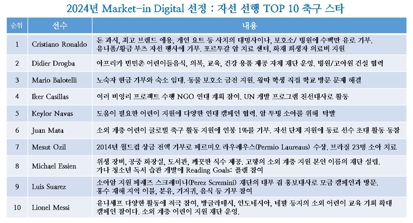 2024년 6월 4일 현재 수입 상위 10명을 보면 억 소리가 난다. 과시하고 지나치게 호사스러운 삶을 산다는 이유로 비난도 받는다. 그러나 봉사, 자선, 후원, 기부도 열심히 하는 선수들도 많다. Market-in Digital 선정 자선을 베푸는 TOP 10을 보면 선수들에게 열정, 헌신, 헌신을 불러일으킨다. 물론 돈으로 환산할 수도 없지만, 금액 기준은 아니다. 당연히 수입과 기부는 비례하지 않는다. 선정 내용은 도표와 같다.