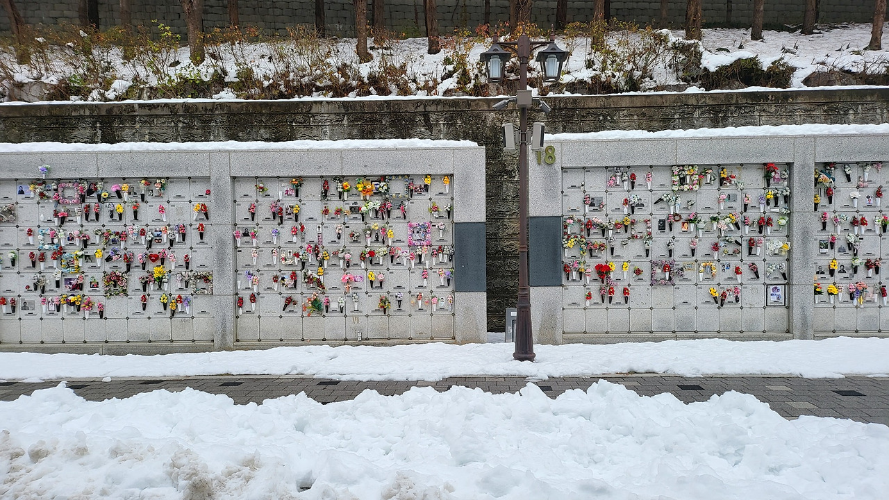 두 집 부부가 각기 아침 일찍 차를 몰고 달려갔다. 경기도 들어서자 여전히 쌓인 눈에 '어디야' 여사가 감탄사를 연실 내뱉으신다. 수원 아들 내외가 40cm 넘게 왔다고 했을 때 그러려니 했는데, 대단하다. 병환이나 고통 없이 노환이시니 복이라며 위로하고 평화로운 잠에 드시길 빌었다. 수원의 '연화장'은 장례식장, 승화장, 추모공간 모두가 있어 서울 시민들이 부러워한다. 일부러 '양' 선생이 진한 농담으로 웃기며 위로했다. 전자 상거래 귀신이 씌어, 이것저것 신상을 두 집에 건네주었다. '김' 교수 본인은 환경에도 후손에게도 좋다는 '잔디장'이 좋겠다고 한다.