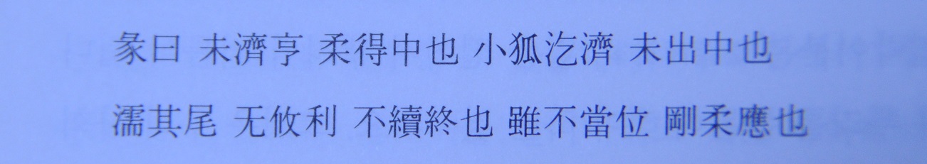 미제괘가 형통하다고 하는 까닭은 음효가 중에 있기 때문이다. 어린여우가 강을 거의 다 건넜다 함은 아직 강 가운데로 부터 나오지 못하였음을 의미한다. 그 꼬리를 적시고 이로울 바가 없다고 한 까닭은 끝마칠 수 없기 때문이다. 비록 모든효가 득위하지 못하였으나 음양상응을 이루고 있다.