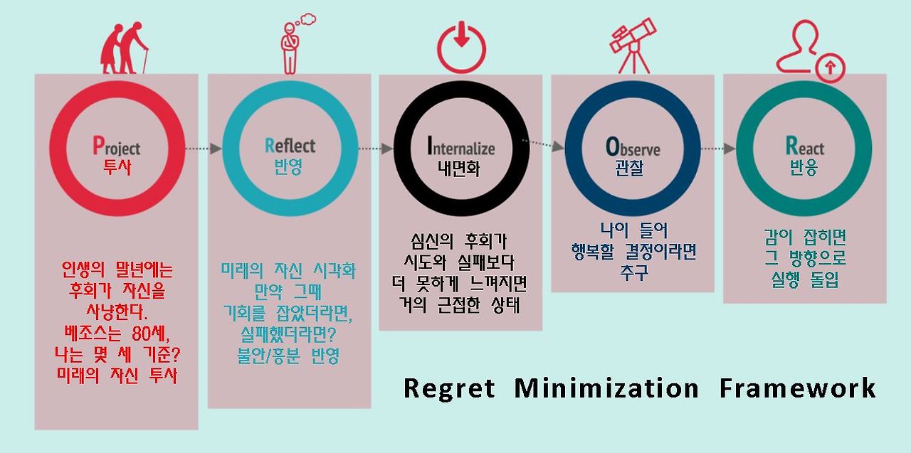 완벽한 결과를 보장하지는 않는다. 인생이나 미래는 예측할 수 없으며 모든 결정에는 위험 부담이 따른다. 하지만 이 방식을 쓰면 장기적인 가치와 행복에 부합하는 선택을 할 가능성이 더 높아진다. '베조스'는 시도하지 않은 것에 대한 후회보다는 실패에 대한 후회로 사는 것이 훨씬 더 쉬울 것이라는 관점에서 결정을 내렸다.