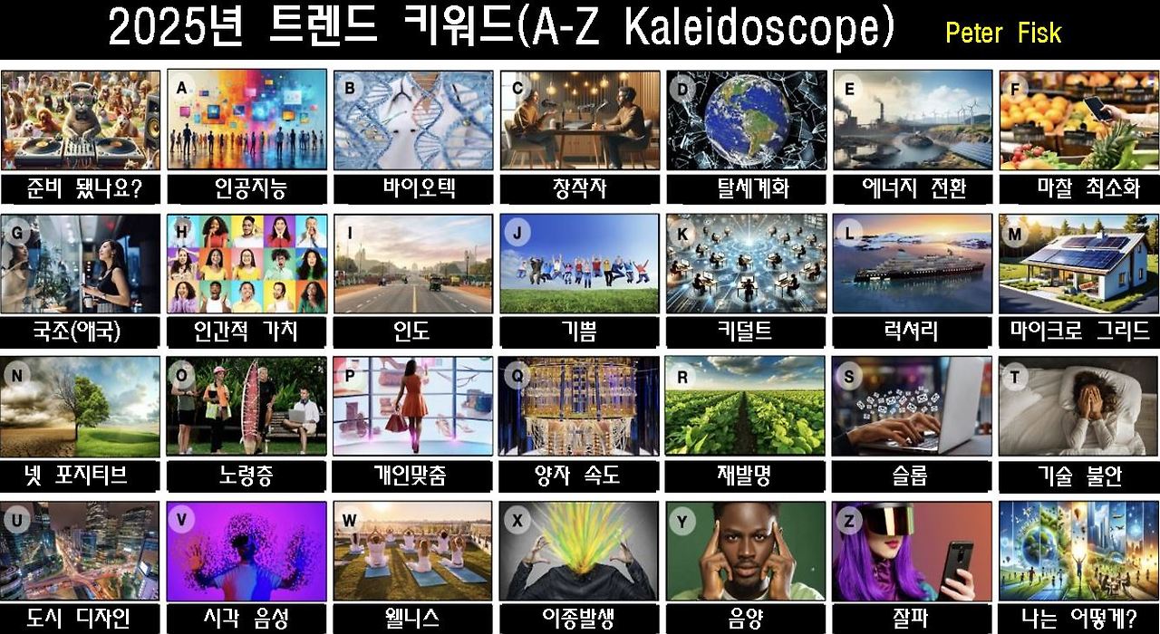 목적, 산업 분야, 지리적 위치에 따라 중요하게 여길 트렌드는 각기 다르다. 그래서 '피터 휘스크(Peter Fisk)는 모두 하나로 모아 '변화의 '만화경(Kaleidoscope)' 보고서 발표했다. 가장 중요한 것이 무엇인지 이해하고 비전과 전략을 구축하고 혁신/성장할 수 있는 최고의 기회를 만드는 방법을 찾아준다. 2025년 글로벌 비즈니스 트렌드를 영어 철자 A~Z까지 26 단어로 요약했다.