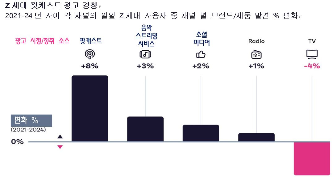 2021년 이후, 팟캐스트를 통해 새로운 제품을 발견하는 Z세대의 수는 TV. 소셜 미디어, 음악 스트리밍 서비스, 라디오 등 보다 더 빠르게 증가했다. 브랜드 발견 증가 추세에 따라 참여할 수 있는 여지가 충분하다. 광고에 가장 큰 불만은 주로 라디오, TV, 스트리밍에 쏟아진다. 팟캐스트 진행자는 방해받는 느낌을 줄여주는 자체 스타일 광고가 가능하다. 청취자에게 관련성이 있고 맞춤화된 경우 특히 잘 먹힌다. Z세대 청취자는 프리미엄 버전 제품을 구매할 가능성이 더 높아 투자 대비 수익성이 높다. 운영 비용도 저렴하므로 투자 대비 큰 수익을 가져올 수 있다.