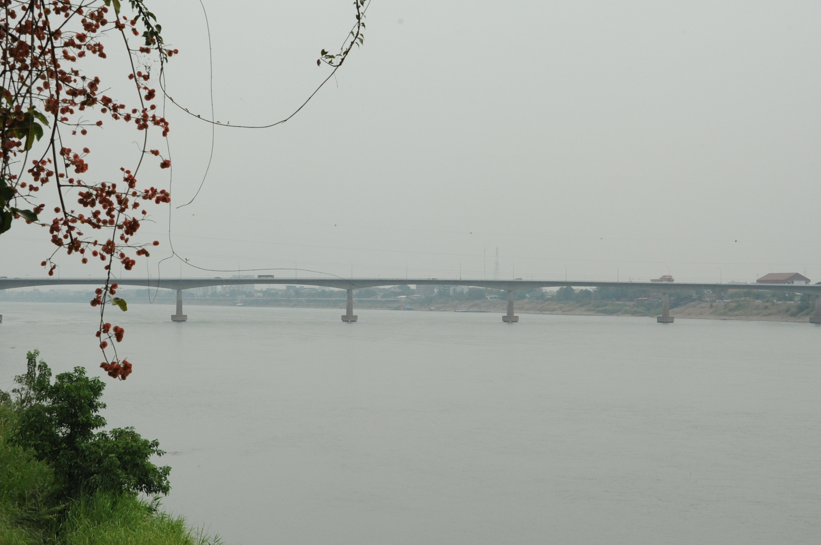 메콩강가의 시원한 바람을 맞으며 원두막에서 점심을 먹으며, 멀리 보이는 메콩강 다리가 보인다. 저 다리를 건너면 바로 태국으로 연결된다. 그래서 과거 태국의 침략을 많이 받았나 보다.