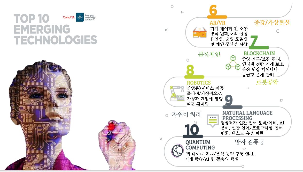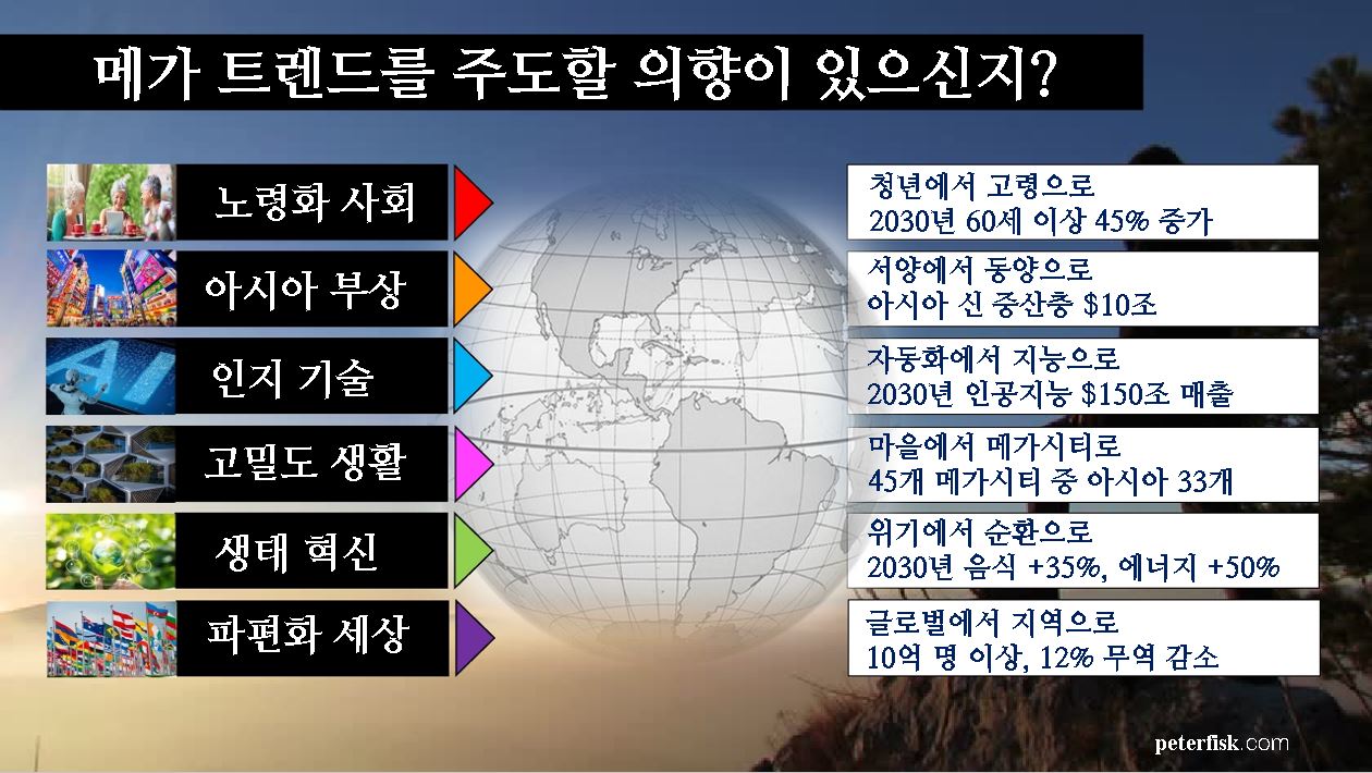 뜨는 10대 기술dms ■ 인공지능 ■ 5세대 통신 ■ 사물인터넷 ■ 서비리스 컴퓨팅 ■ 생체인식 ■ 증강/가상현실 ■ 블록체인 ■ 로봇공학 ■ 자연어처리 ■ 양자 컴퓨팅이다. 한편 미래를 형성하고 우리의 삶 방식을 바꾸는 것은 5가지 메가트렌드다. 앨빈 토플러(Alvin Toffler)는 저서 미래 충격(Future Shock)에서 세계 경제에 일어나고 있는 엄청난 구조적 변화와 정보화 시대의 '초산업 사회'를 향한 기술 발전의 가속화를 지적하면서 새로운 탈산업 시대의 분수령을 확인했다. 50년이 지난 지금 우리는 그가 예측했던 많은 일이 현실이 되는 것을 목격하고 있다. UN 및 OECD를 포함한 다양한 데이터 소스와 Max Roser의 환상적인 웹사이트 OurWorldinData.org를 사용하여 Peter Fisk는 2023년 마지막 강연에서 6가지 트렌드와 사업에 미치는 영향을 업데이트했다.