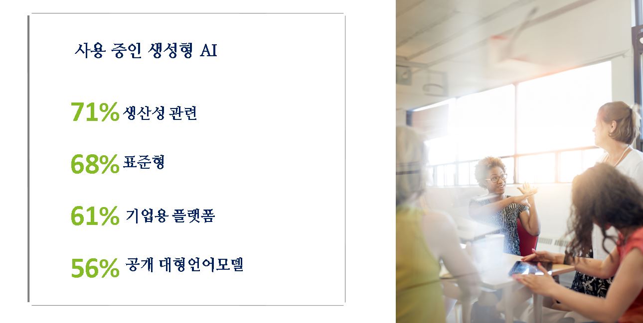 전술적 이점이 부각되면서 대다수가 기성 솔루션에 의존하고 있다. 주로 생성형 AI가 통합된 생산성 엔터프라이즈 플랫폼 61%, 표준형 68%, ChatGPT 같은 공개 사용 LLM(대규모 언어 모델) 56%다. 산업별 특화 앱 23%, 개인 LLM 32% 및/또는 오픈 소스 LLM 사업 맞춤화 25%로 나타났다. 특화된 솔루션 사용을 보고한 응답자는 상대적으로 적다. 기성 솔루션은 기존 활동의 효율성/생산성 향상에 주로 초점을 맞춘 초기 단계 수준이다. 그러나 사용 사례가 더욱 전문화/전략적화로 변하면서 개발 방식과 기술 인프라도 이를 따를 가능성이 높다. 특정 기업/기능/산업의 요구에 맞춰 차별화/맞춤화된 본격적인 사용은 언제쯤 될까? 전략적 차별화가 가능한 맞춤 생성형 AI 도구를 구비하려면 어떻게 내부/외부 자원을 결합해야 하나? 특히 기성 민간 개발 또는 공공/민간 협업 개발 방식과 차별화된 솔루션을 제공하고 지원할 수 있는 기술 인프라 보완이 언제쯤 등장할 것인가? 등이 관심 대상이다.
