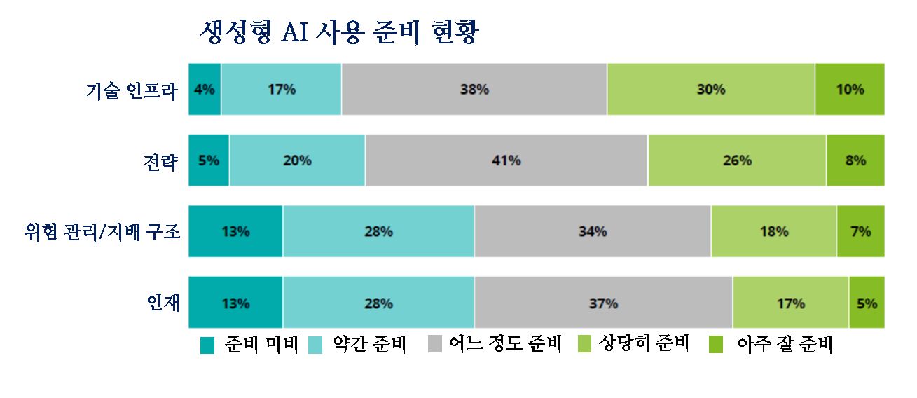 리더의 41%는 자기 조직이 생성형 AI 채택과 관련 인력 준비가 거의 또는 전혀 준비되어 있지 않다고 답했다. 22%만 상당 수준으로 준비 또는 매우 잘 준비되어 있다고 답했다. 마찬가지로 41%는 도입과 관련하여 거버넌스 및 위험 문제 해결에 준비가 거의 또는 전혀 안 되어 있다고 답했다. 25%만이 상당 수준으로 준비되어 있거나 매우 잘 준비되어 있다고 응답했다.
